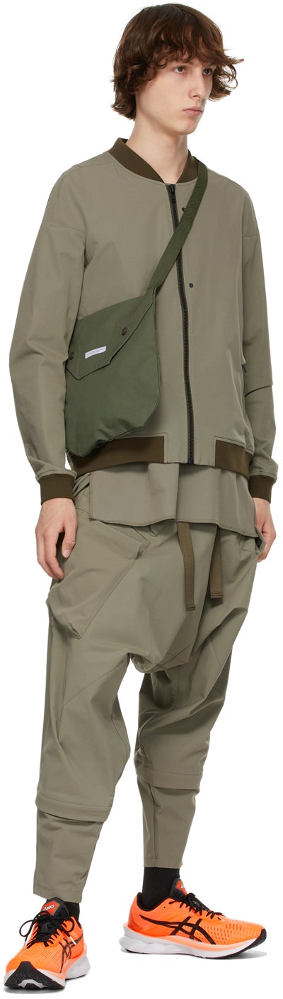 Long sleeve stretch nylon twill bomber jacket in khaki featuring schoeller® 3XDRY® and DRYSKIN™ technology. Water-resistant and fast-drying. Rib knit stand collar, cuffs, and hem. Zip closure at front. Zippered pockets at waist. Patch pockets and tonal detachable and adjustable elasticized webbing shoulder straps featuring Velcro fastening at interior. Black hardware. Supplier color: Alpha green 91% polyamide, 9% elastane. Brand: ACRONYM
