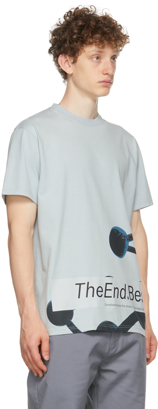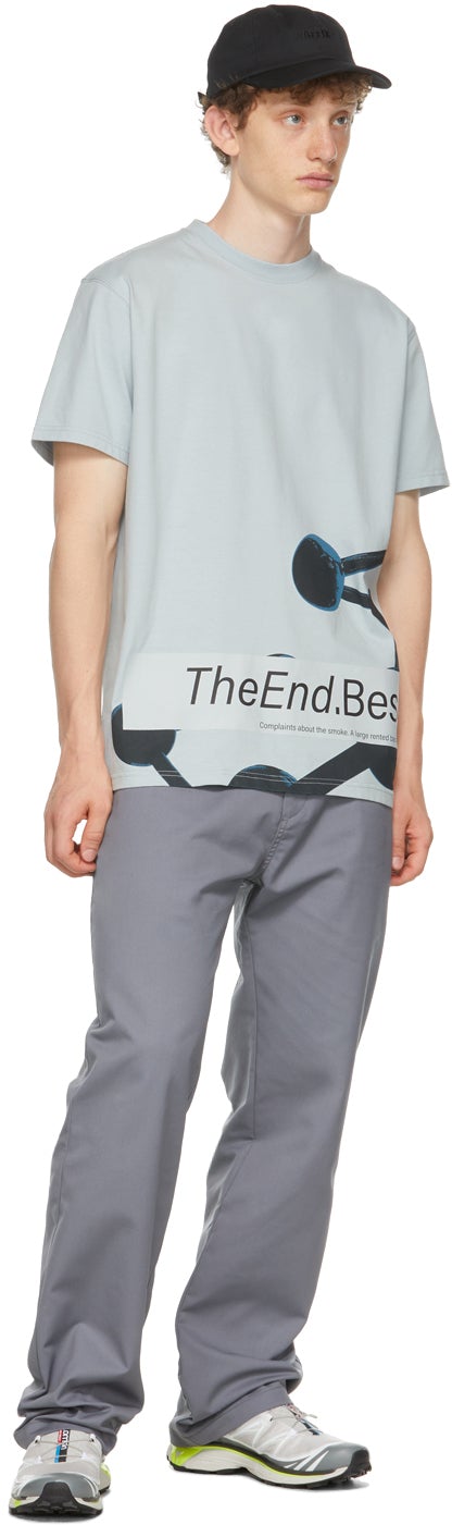 Short sleeve heavyweight organic cotton jersey T-shirt in blue. Graphic printed in navy and black throughout. Rib knit crewneck collar. Tonal textile patch featuring text bonded in black at waist. Supplier color: Powder blue 100% cotton. Brand: Affix