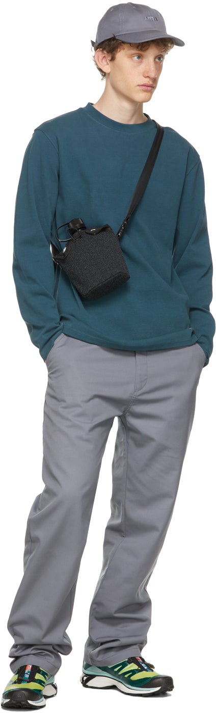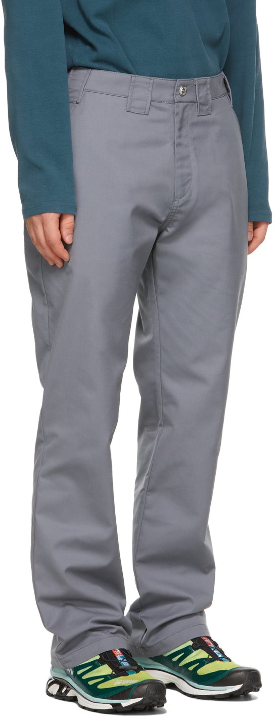 Straight-leg crease-resistant cotton-blend twill trousers in grey. Mid-rise. Four-pocket styling. Belt loops at waistband. Tonal logo embroidered at back waistband. Zip-fly. Logo-engraved silver-tone hardware. Supplier color: Grey 65% polyester, 35% cotton. Brand: Affix
