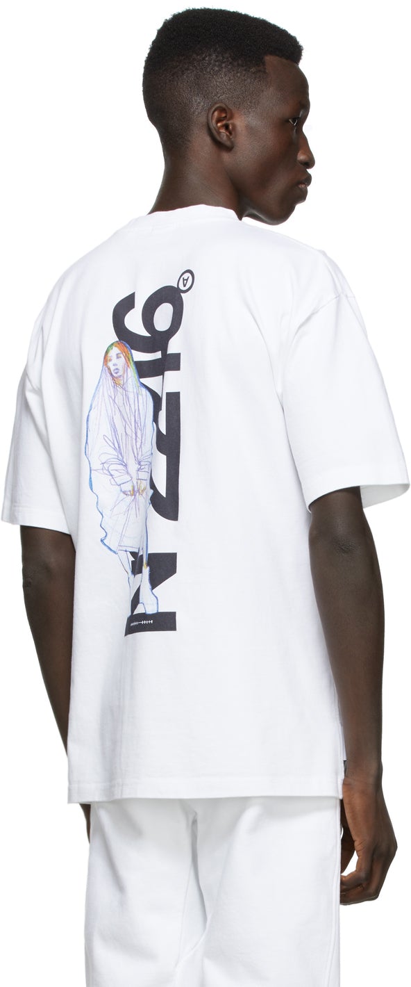 Short sleeve cotton jersey T-shirt in white. Rib knit crewneck collar. Logo printed in black at chest. Graphic printed in multicolor at back. Supplier color: White 100% cotton. Brand: Aitor Throup’s TheDSA