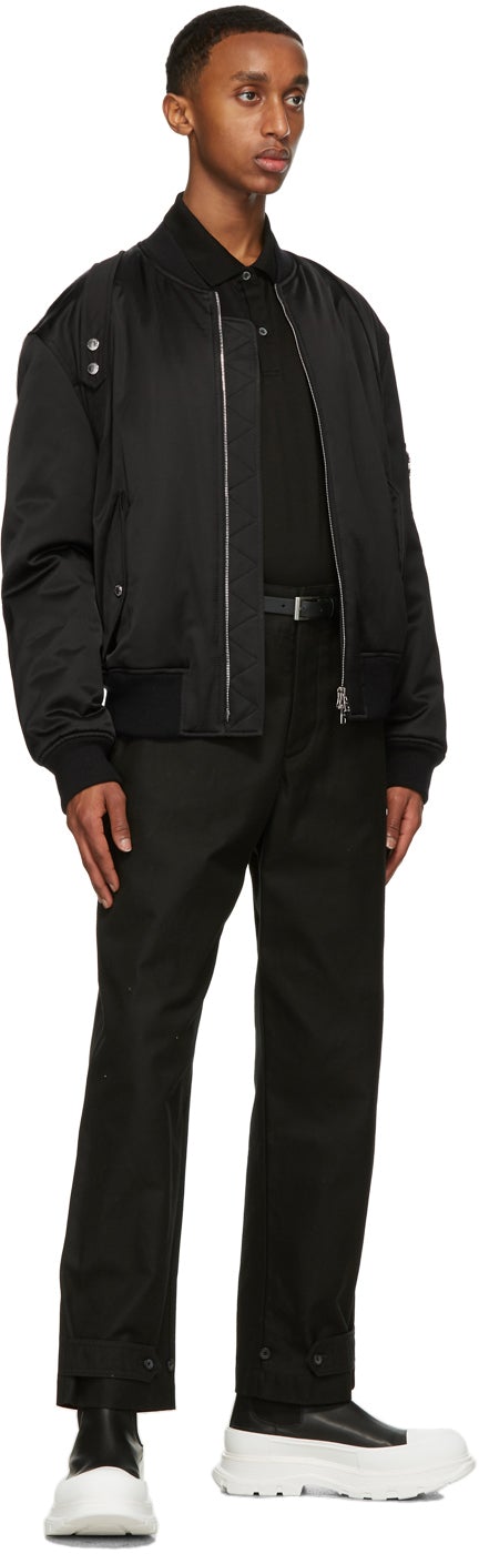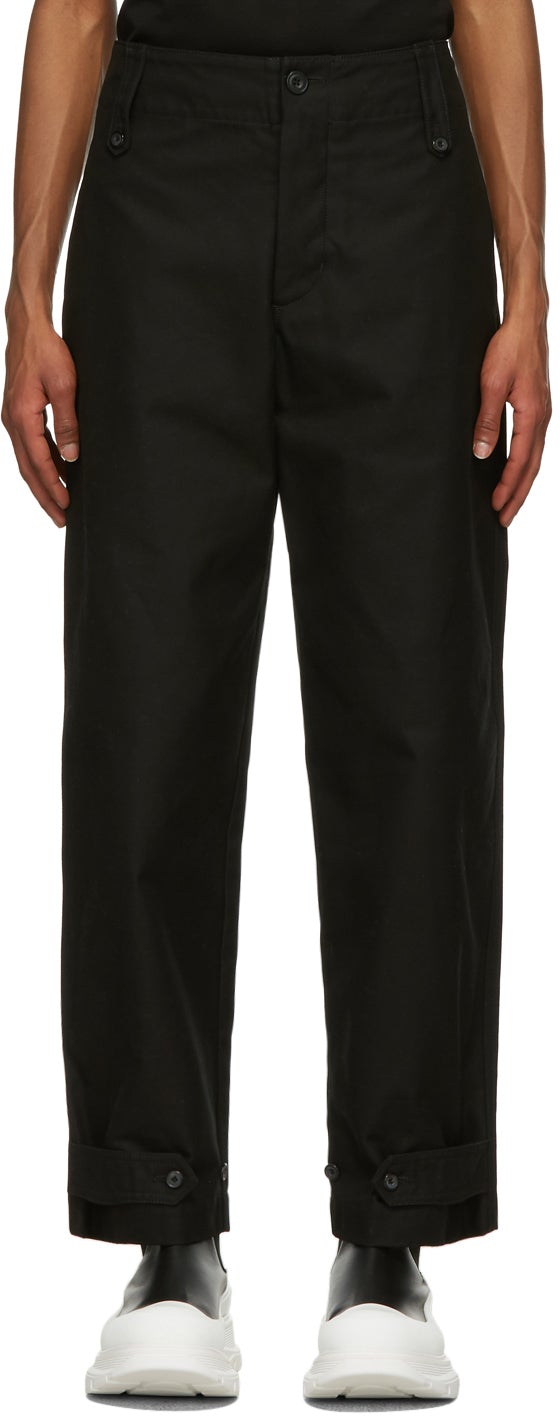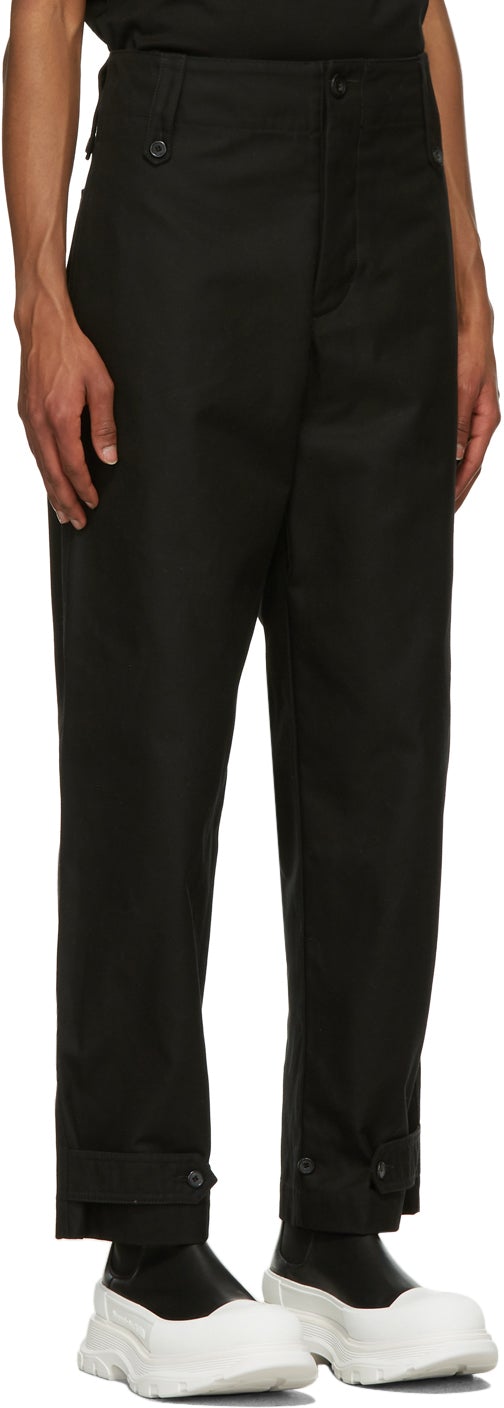 Tapered cotton twill trousers in black. Mid-rise. Four-pocket styling. Belt loops at waistband. Adjustable buttoned tab at cuffs. Button-fly. Gold-tone hardware. Supplier color: Black 100% cotton. Brand: Alexander McQueen
