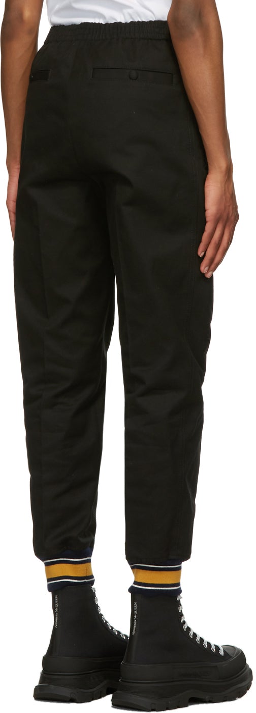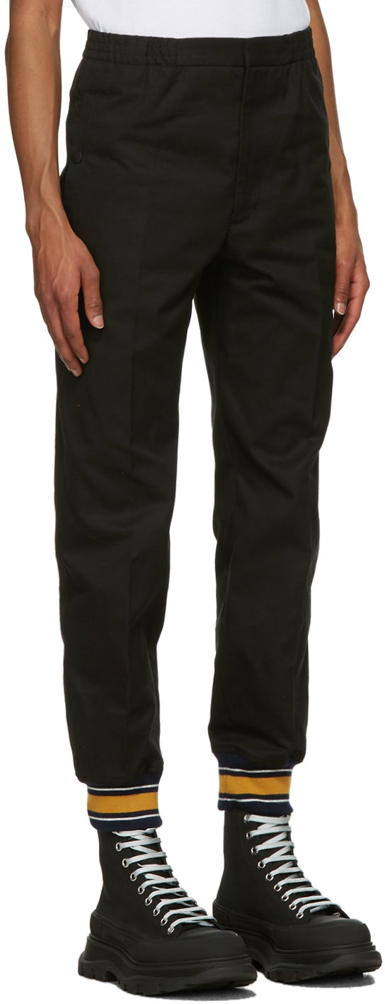 Slim-fit cotton canvas trousers in black. Mid-rise. Elasticized waistband. Four-pocket styling. Central creases at front and back legs. Elasticized rib knit wool cuffs featuring stripe pattern in navy, white, and yellow. Zip-fly. Tonal hardware. Supplier color: Black Body: 100% cotton. Trim 1: 90% wool, 8% polyamide, 2% elastane. Trim 2: 100% cotton. Brand: Alexander McQueen