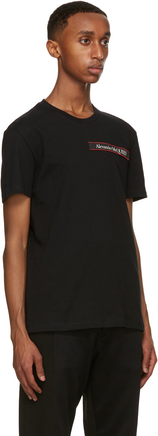 Short sleeve cotton jersey T-shirt in black. Rib knit crewneck collar. Embroidered logo appliqué in red and white at chest. Supplier color: Black 100% cotton. Brand: Alexander McQueen
