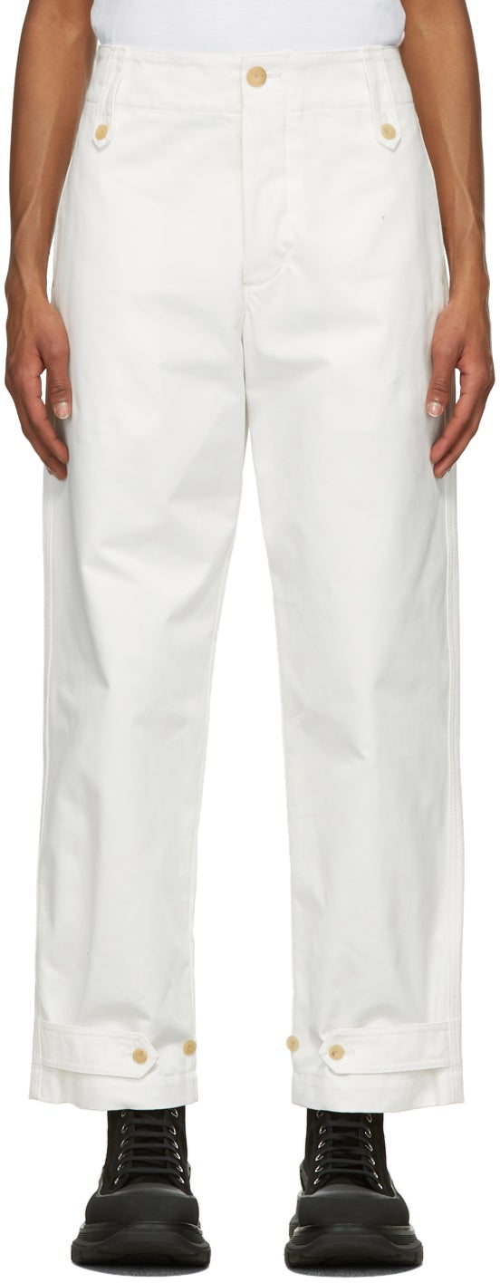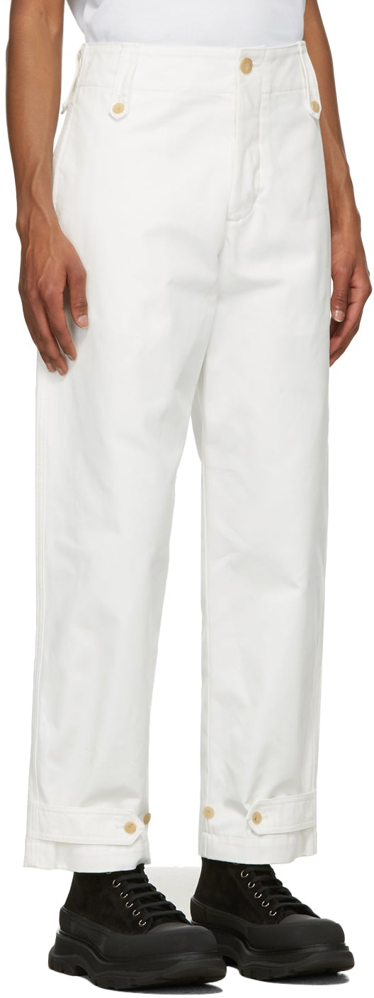 Tapered cotton canvas trousers in white. Mid-rise. Four-pocket styling. Belt loops with button fastening at waistband. Adjustable buttoned tabs at cuffs. Button-fly. Beige hardware. Supplier color: White 100% cotton. Brand: Alexander McQueen