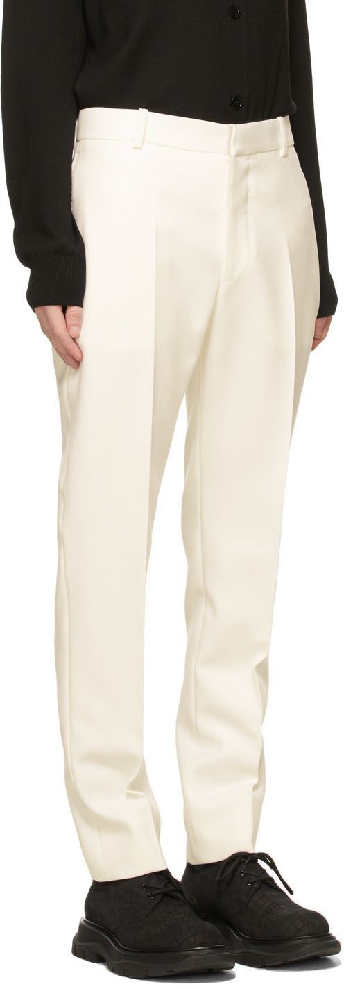 Slim-fit wool gabardine trousers in white. Mid-rise. Four-pocket styling. Belt loops at waistband. Central crease at front. Tonal cupro satin lining. Zip-fly. Supplier color: Ivory Body: 100% wool. Lining: 100% cupro. Brand: Alexander McQueen