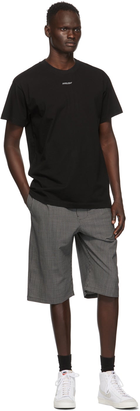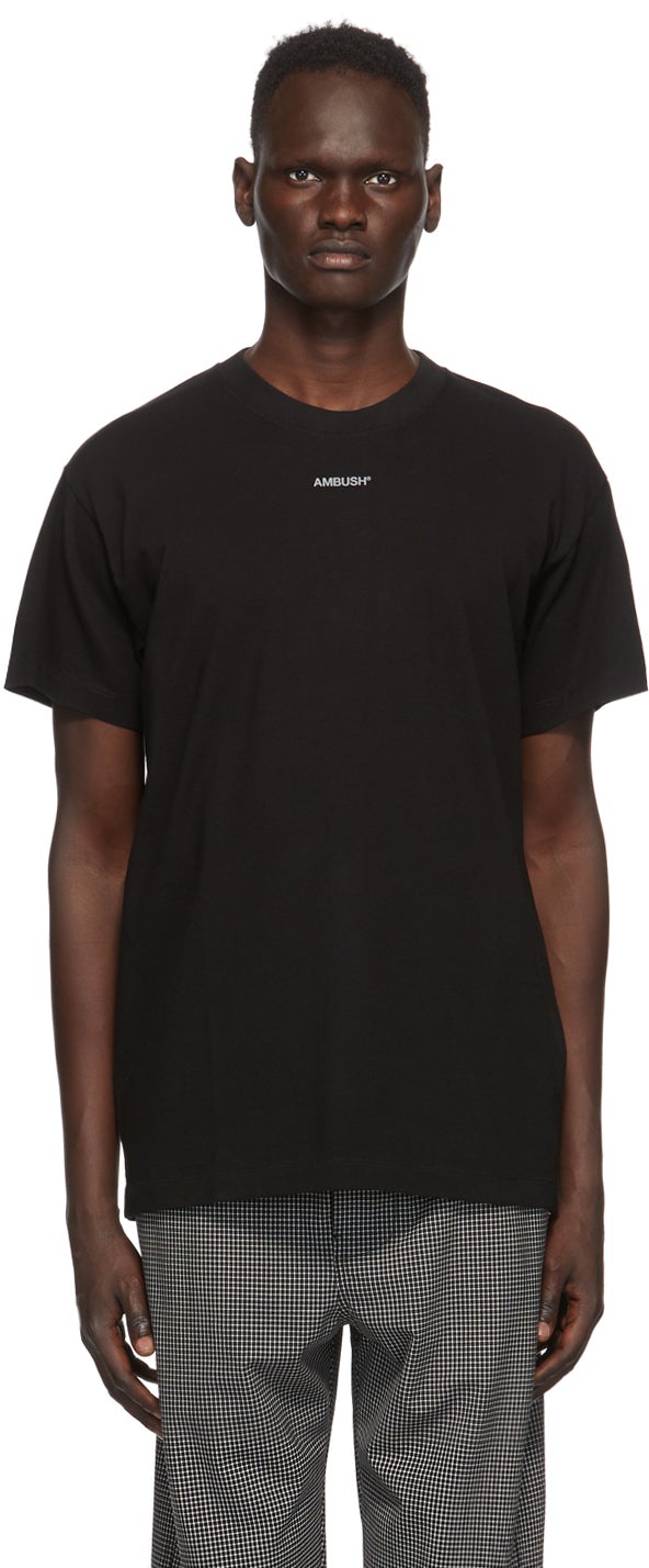 Short sleeve cotton jersey T-shirt in black. Rib knit crewneck collar. Logo and text printed in grey at chest and back. Supplier color: Black/Dark grey Body: 100% cotton. Trim: 98% cotton, 2% elastane. Brand: AMBUSH