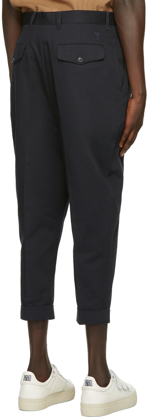 Tapered cotton gabardine trousers in navy. Mid-rise. Four-pocket styling. Belt loops at waistband. Tonal embroidered logo at back waistband. Pleats at front. Central creases at back. Rolled cuffs. Button-fly. Black hardware. Supplier color: Navy 100% cotton. Brand: AMI Alexandre Mattiussi