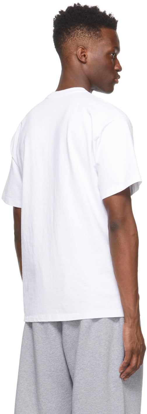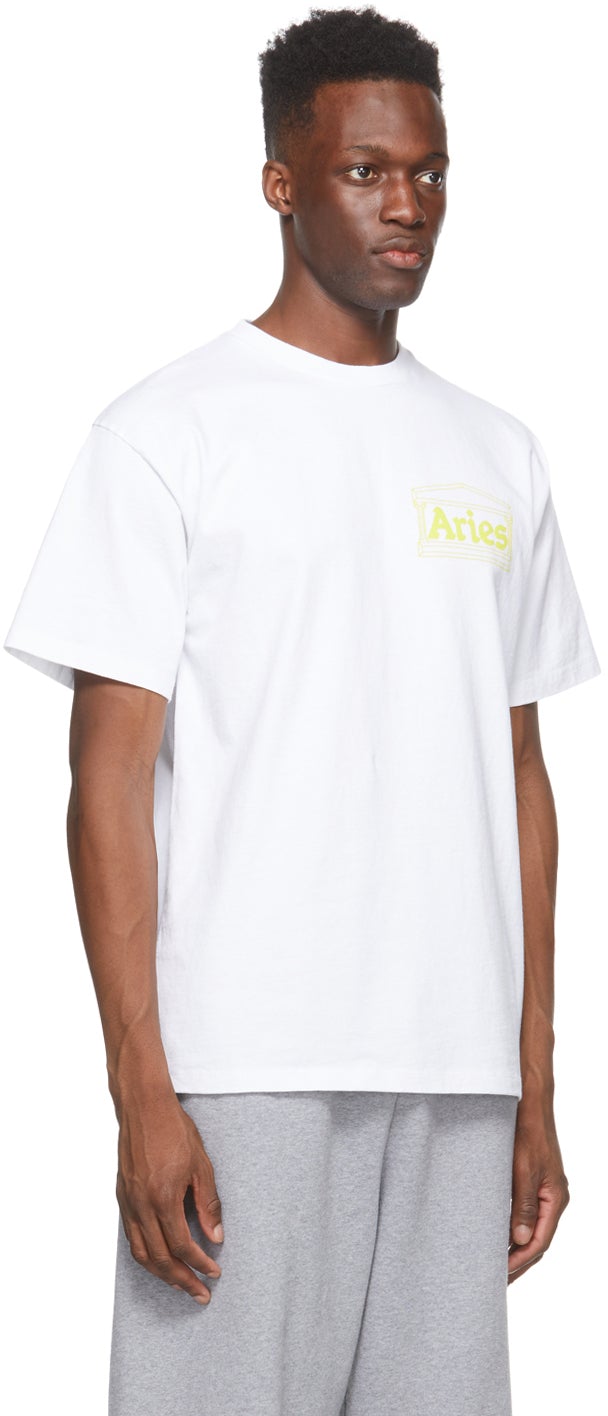 Shorts sleeve cotton jersey T-shirt in white. Rib knit crewneck collar. Logo graphic printed in green at chest. Supplier color: White 100% cotton. Brand: Aries