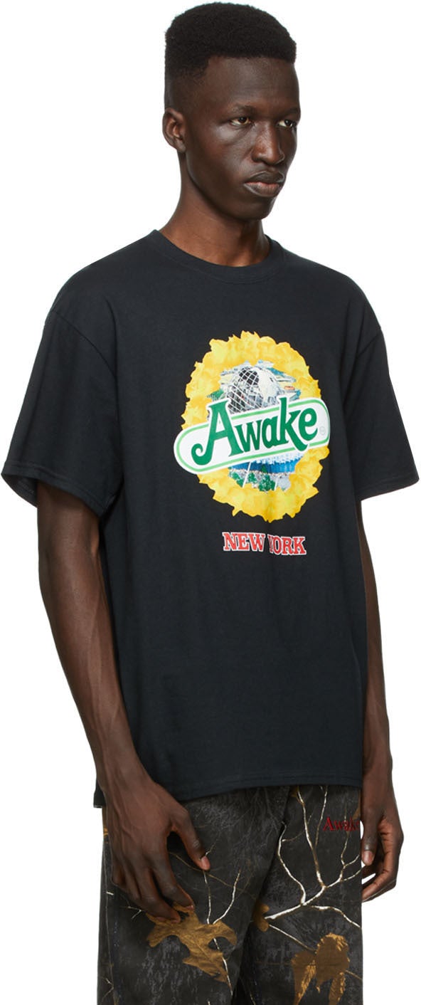 Short sleeve cotton jersey T-shirt in black. Rib knit crewneck collar. Multicolor logo graphic printed at front. Supplier color: Black 100% cotton. Brand: Awake NY