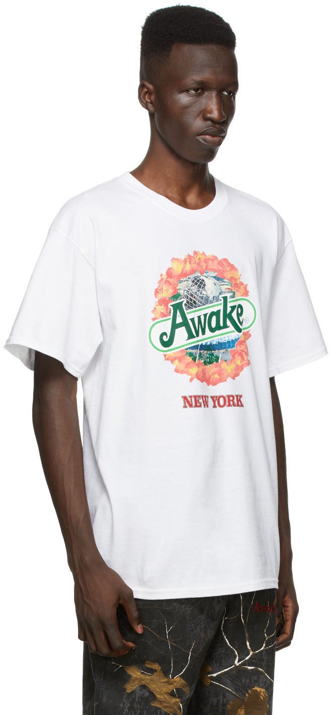 Short sleeve cotton jersey T-shirt in white. Rib knit crewneck collar. Multicolor logo graphic printed at front. Supplier color: White 100% cotton. Brand: Awake NY