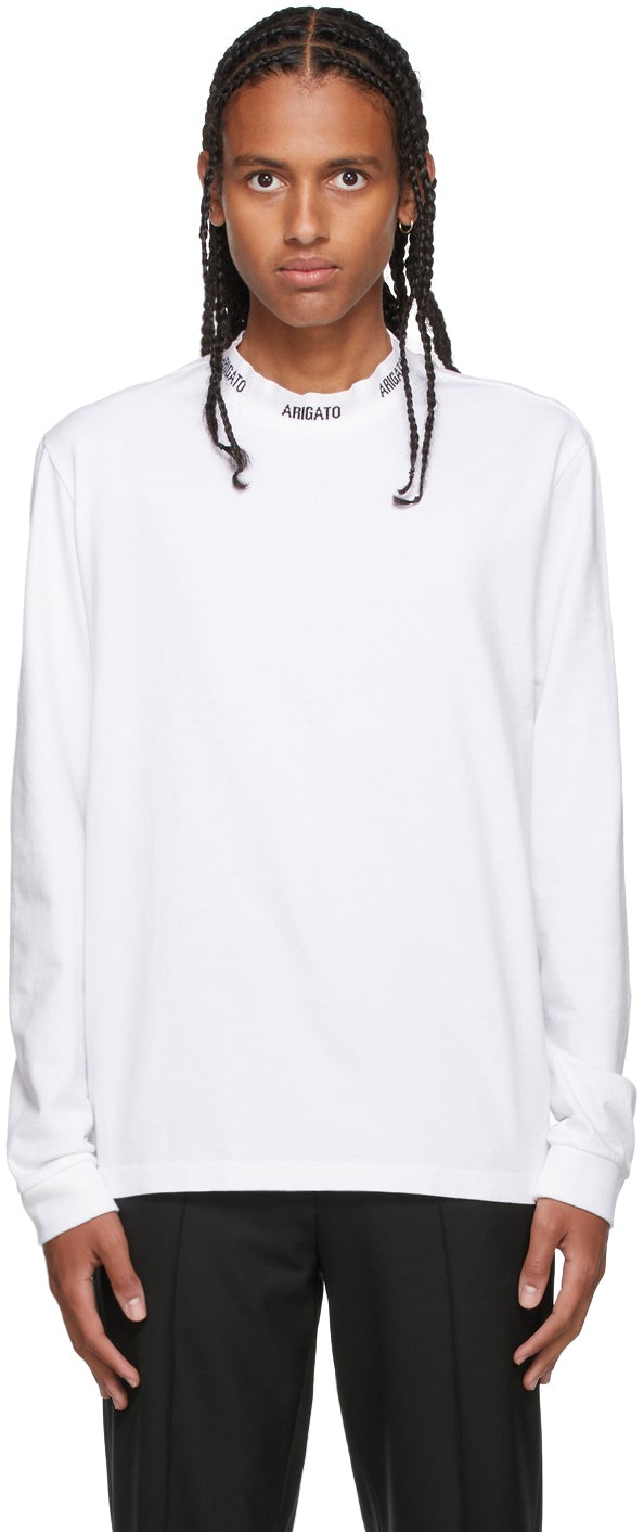 Long sleeve organic cotton jersey T-shirt in white. Jacquard knit logo in black at rib knit mock neck collar. Rib knit cuffs. Supplier color: White 100% organic cotton. Brand: Axel Arigato