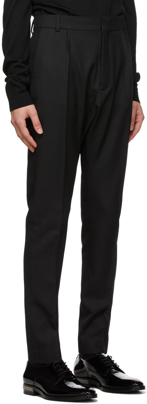 Tapered virgin wool twill trousers in black. Mid-rise. Dropped inseam. Four-pocket styling. Belt loops at waistband. Pleats and central creases at front. Partial jersey lining. Tonal hardware. Supplier color: Black Body: 100% virgin wool. Lining: 97% cotton, 3% elastane. Brand: Balmain
