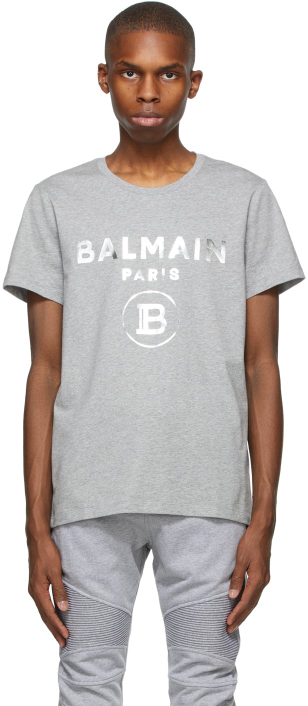 Short sleeve cotton jersey T-shirt in heather grey. Crewneck collar. Logo printed in silver-tone at chest. Supplier color: Grey 100% cotton. Brand: Balmain