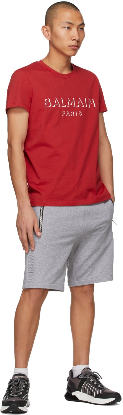 Short sleeve cotton jersey T-shirt in red. Rib knit crewneck collar. Logo bonded in white at front. Supplier color: Red 100% cotton. Brand: Balmain