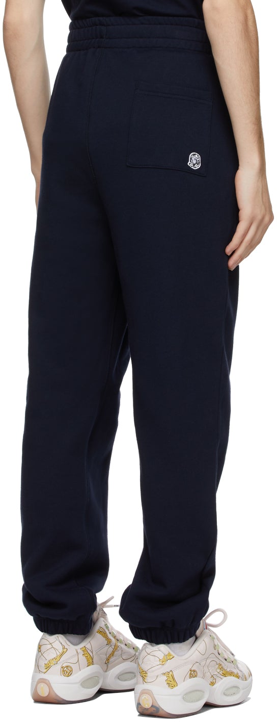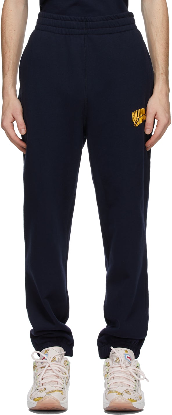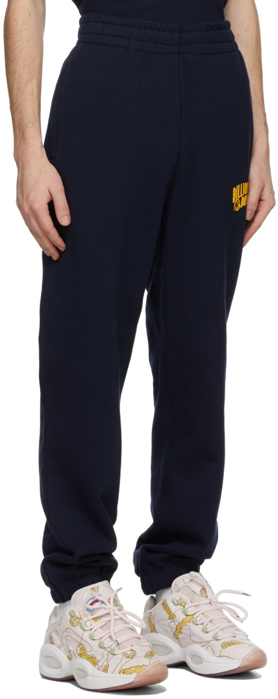 Relaxed-fit French terry lounge pants in navy. Mid-rise. Three-pocket styling. Concealed drawstring at elasticized waistband. Logo printed in yellow at front. Embroidered logo appliqué in white at back pocket. Elasticized cuffs. Supplier color: Navy 100% cotton. Brand: Billionaire Boys Club
