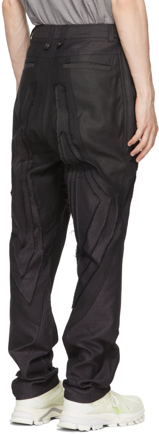 Tapered paneled woven wool and cotton-blend trousers in black. Welt pockets and zippered pockets throughout. Raw edges throughout. Mid-rise. Four-pocket styling. Belt loops at waistband. Zip-fly. Gunmetal-tone hardware. Supplier color: Shiny black 35% wool, 34% cotton, 31% polyester. Brand: Blackmerle