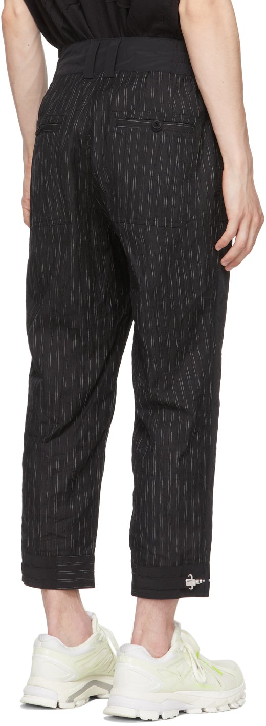 Straight-leg cotton and linen-blend trousers in black featuring graphic pattern in white throughout. Mid-rise. Four-pocket styling. Drawstring and belt loops at waistband. Zipper detailing at cuffs. Zip-fly. Silver-tone hardware. Supplier color: Black 50% cotton, 50% linen. Brand: Blackmerle