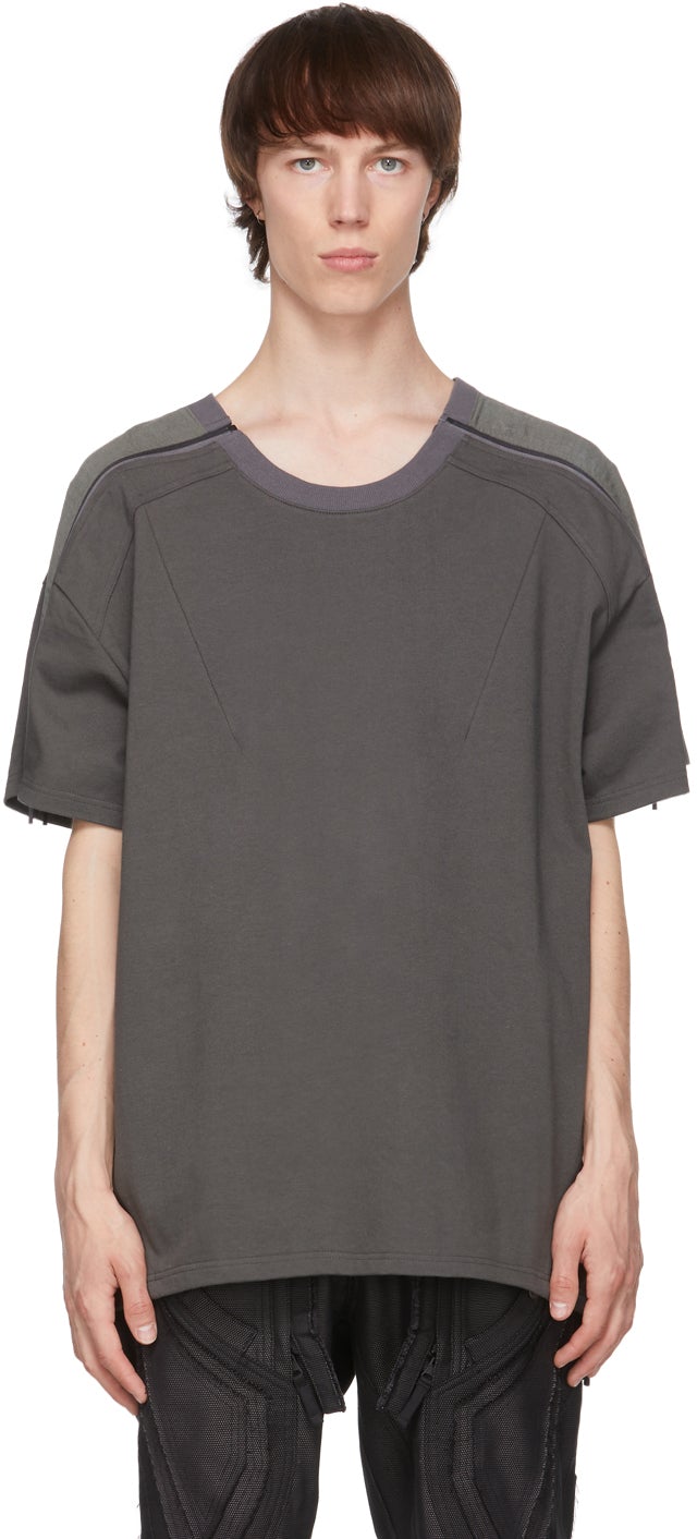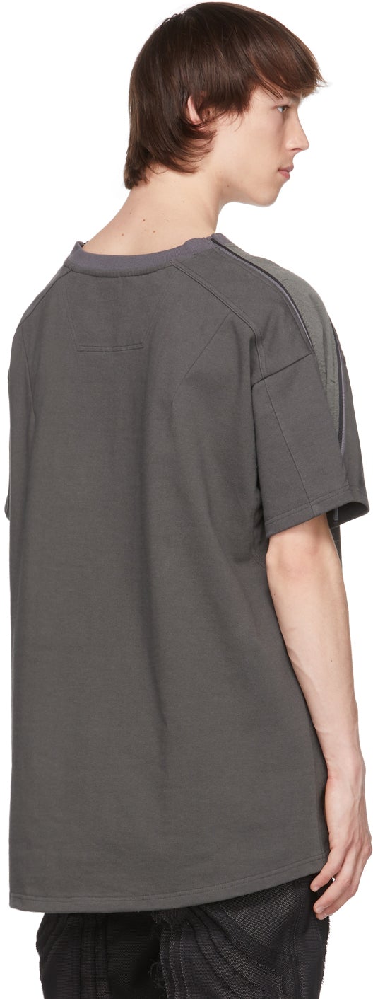 Short sleeve paneled cotton jersey T-shirt in dark green. Rib knit crewneck collar. Darts at front. Tonal knit wool trim and zip closure at sleeves. Tonal hardware. Supplier color: Dark green Body: 100% cotton. Trim: 100% wool. Brand: Blackmerle