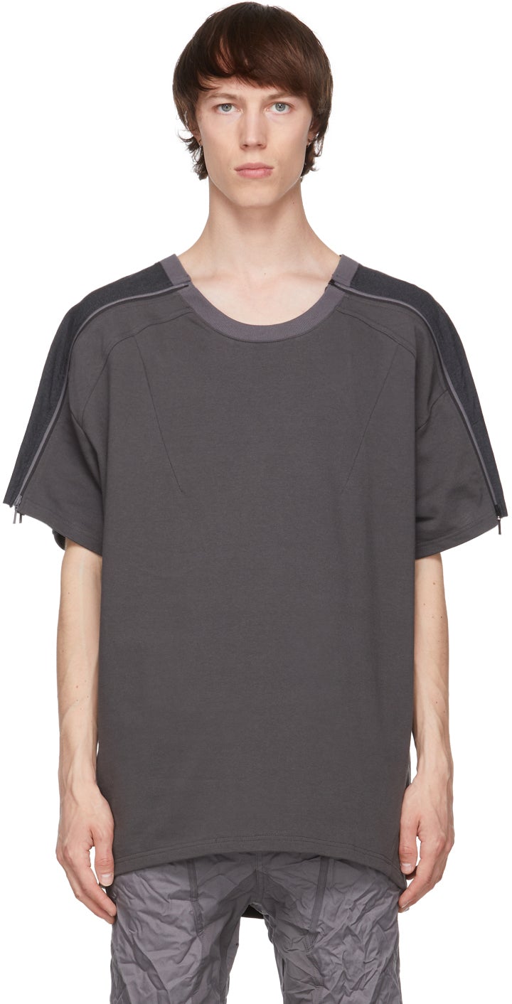 Short sleeve paneled cotton jersey T-shirt in dark grey. Rib knit crewneck collar. Darts at front. Tonal knit wool trim and zip closure at sleeves. Tonal hardware. Supplier color: Dark grey Body: 100% cotton. Trim: 100% wool. Brand: Blackmerle