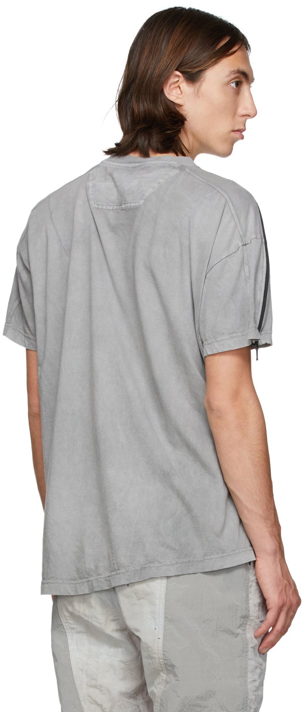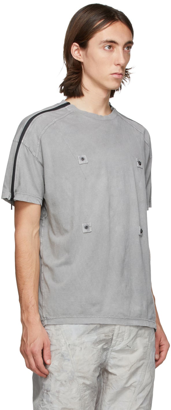 Short sleeve cotton jersey T-shirt in grey. Fading throughout. Rib knit crewneck collar. Tonal canvas patches with press-stud hardware at front. Zippered vent at sleeves. Black and antiqued silver-tone hardware. Supplier color: Charcoal 100% cotton. Brand: Blackmerle