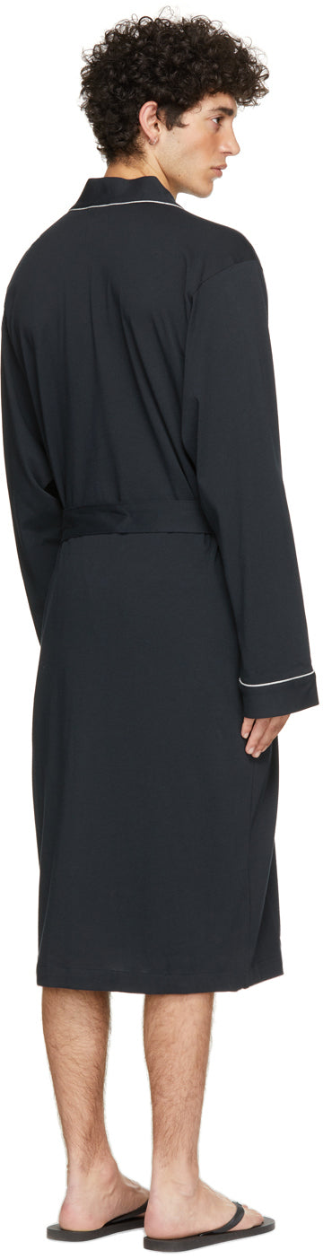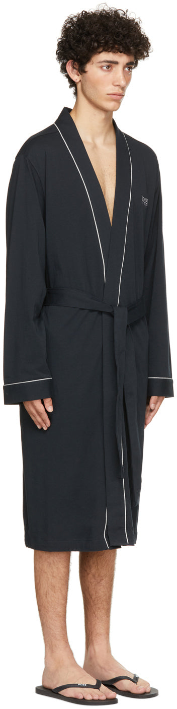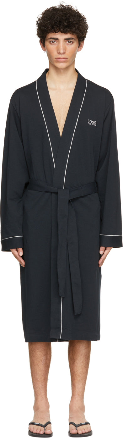 Long sleeve cotton jersey robe in navy. Piping in grey throughout. Shawl collar. Logo embroidered in grey at chest. Welt pockets, belt loops, and self-tie belt at waist. Supplier color: Dark blue 100% cotton. Brand: Boss
