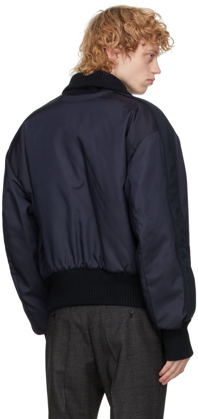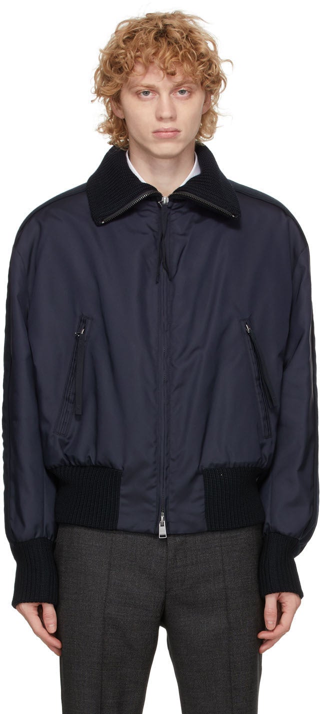 Long sleeve nylon jacket in navy. Rib knit cotton spread collar, cuffs, and hem. Two-way zip closure at front. Zippered pockets at waist. Tonal wool-blend trim at sleeves. Quilted satin lining in black. Partially lined. Gunmetal-tone hardware. Supplier color: Navy Body: 100% polyamide. Lining: 100% polyester. Trim 1: 100% cotton. Trim 2: 54% polyester, 46% wool, 1% elastane. Brand: Boss