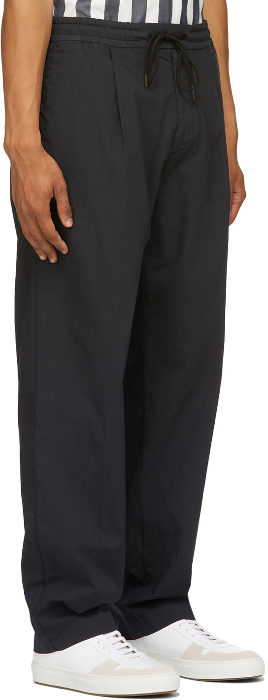 Straight-leg stretch cotton poplin trousers in navy. Mid-rise. Four-pocket styling. Drawstring at elasticized waistband. Pleats at front waistband. Central creases at front and back. Logo plaque at back pocket. Zip-fly. Gunmetal-tone and silver-tone hardware. Supplier color: Dark blue 97% cotton, 3% elastane. Brand: Boss