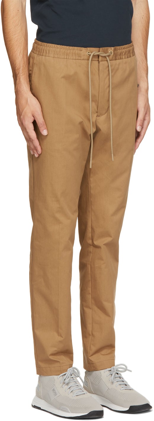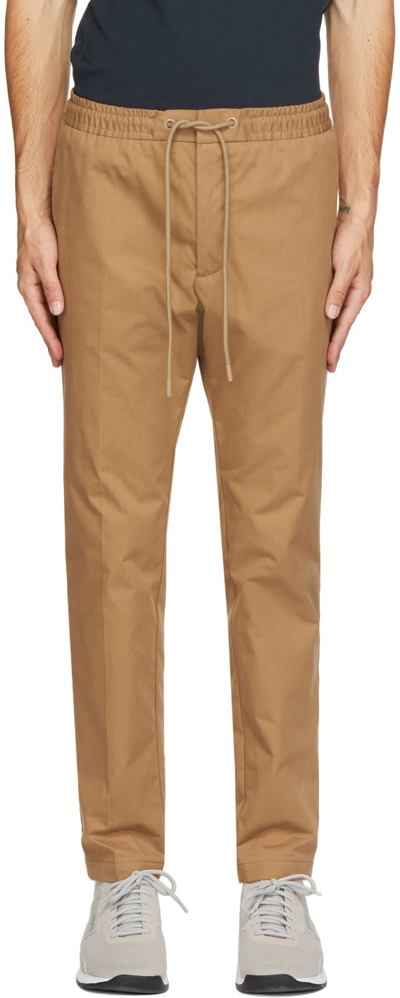 Slim-fit cotton poplin lounge pants in tan. Mid-rise. Four-pocket styling. Drawstring at elasticized waistband. Central crease at legs. Tonal hardware. Supplier color: Medium beige 100% cotton. Brand: Boss