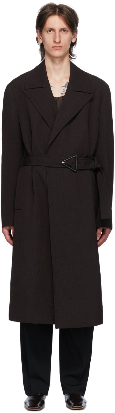 Long sleeve wool drill jacket in brown. Peaked lapel collar. Double-breasted open front. Welt pockets and detachable and adjustable pin-buckle belt at waist. Central vent at back hem. Welt pockets at interior. Fully lined. Supplier color: Fondente Body: 100% wool. Lining: 100% viscose. Brand: Bottega Veneta