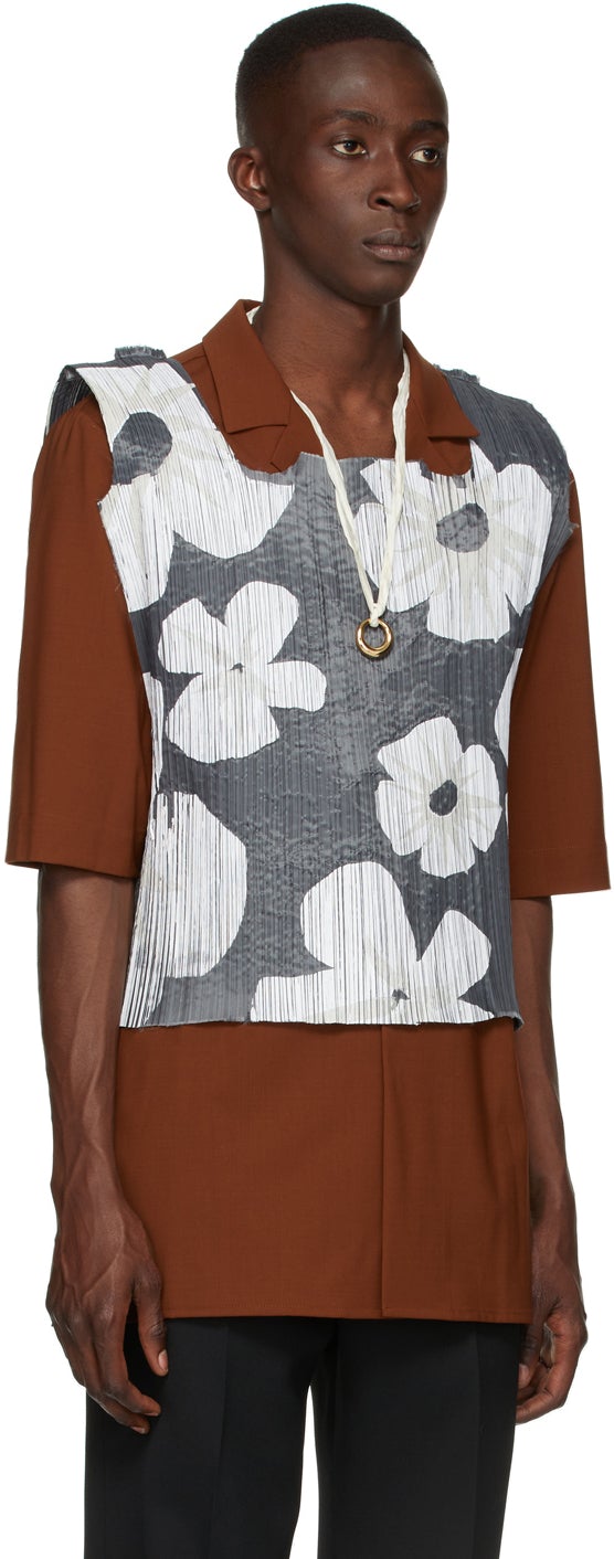 Sleeveless garment-pleated jersey tank top in grey featuring graphic pattern printed in white and grey. Raw edges throughout. Modified square neck collar. Vents at armscyes. Supplier color: Grey/White flowers 100% polyester. Brand: Botter