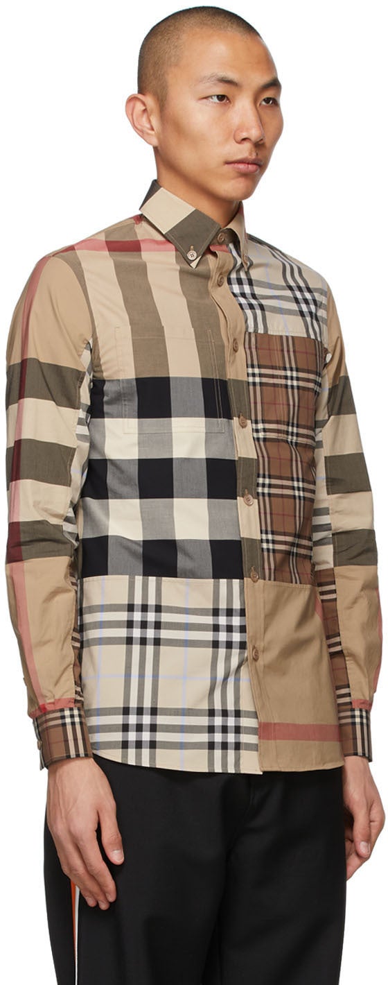 Long sleeve cotton poplin shirt colorblocked in beige and brown. Mismatched check patterns in tones of black, red, and white throughout. Spread collar. Button closure at front. Patch pocket at chest. Two-button barrel cuffs. Shirttail hem. Tonal hardware. Supplier color: Light almond Body 1: 100% cotton. Body 2: 95% cotton, 5% elastane. Brand: Burberry