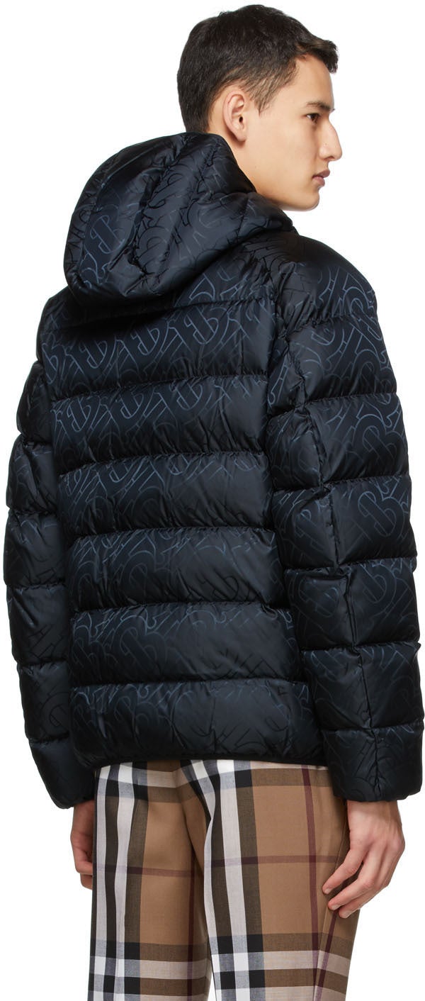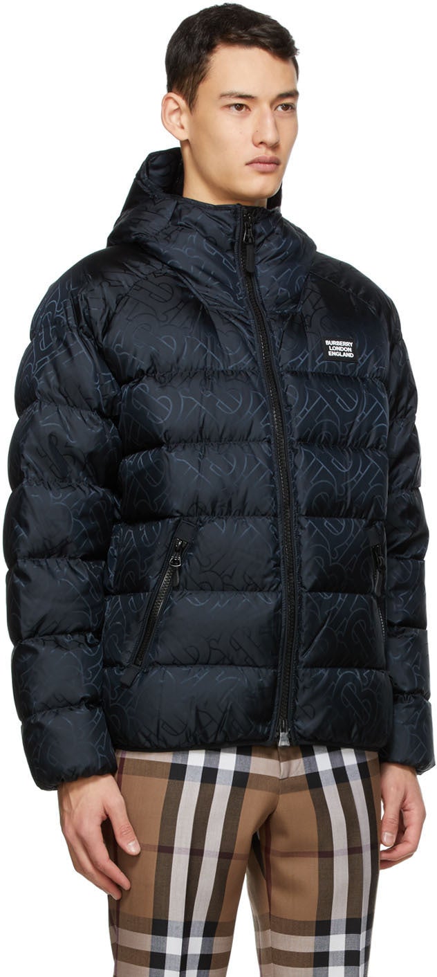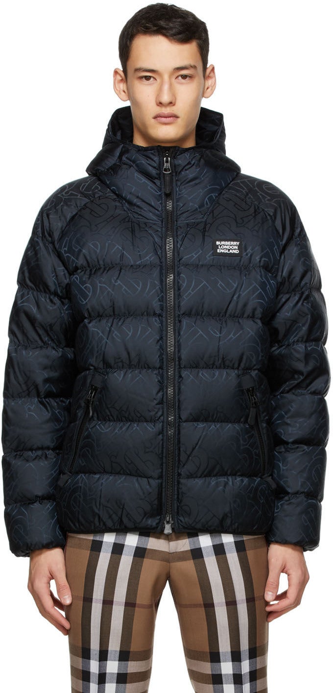 Long sleeve down-filled quilted jacket in black featuring tonal jacquard-woven logo pattern throughout. Two-way zip closure at front. Rubberized logo appliqué at chest. Zippered pockets at waist. Elasticized trim at cuffs and hem. Zippered pocket at interior. Fully lined. Tonal hardware. Supplier color: Black Fill: 90% goose down, 10% goose feathers. Body: 100% polyamide. Lining: 100% polyamide. Brand: Burberry