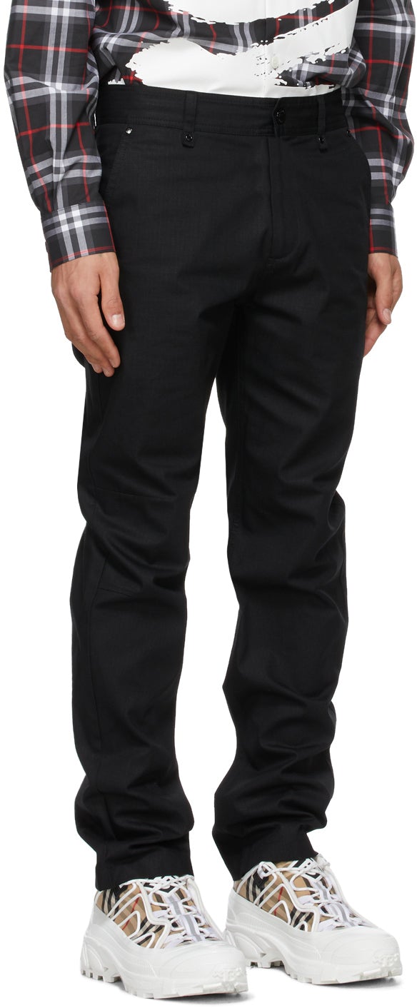 Straight-leg cotton ripstop trousers in black. Mid-rise. Four-pocket styling. Belt loops and eyelet vents at waistband. Darts at knees. Zip-fly. Tonal logo-engraved hardware. Supplier color: Black 100% cotton. Brand: Burberry