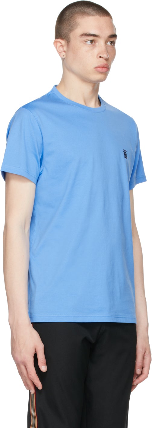 Short sleeve cotton jersey T-shirt in blue. Rib knit stretch cotton crewneck collar. Logo embroidered in black at chest. Supplier color: Vivid cobalt Body: 100% cotton. Trim: 97% cotton, 3% elastane. Brand: Burberry