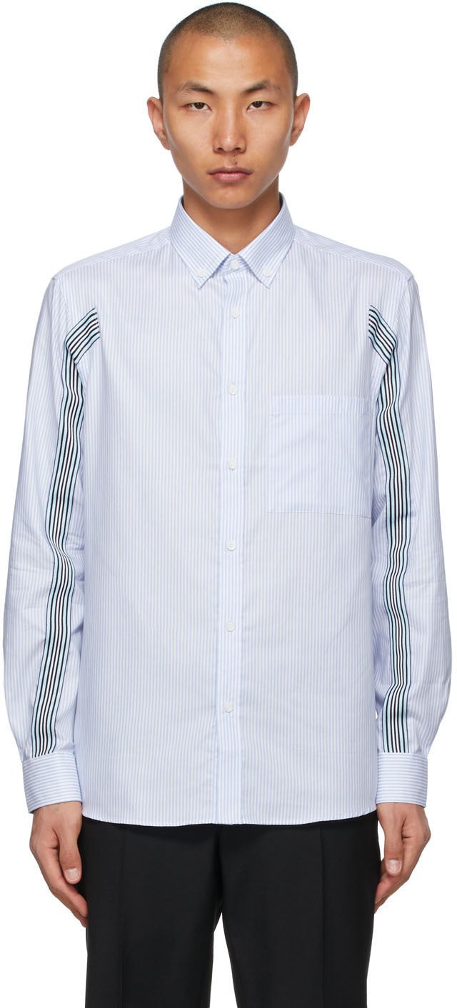 Long sleeve cotton Oxford cloth shirt striped in white and blue. Spread collar. Button closure at front. Patch pocket at chest. Knit trim striped in blue, black, and white at sleeves. Shirttail hem. Mother-of-pearl hardware. Supplier color: Pale blue stripe 100% cotton. Brand: Burberry