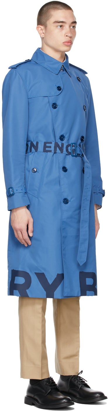 Long sleeve nylon canvas trench coat in blue. Hook-eye fastening at spread collar. Double-breasted button closure at front. Button-down storm flap at chest. Belt loops, D-ring hardware, and welt pockets at waist. Adjustable and detachable belt with logo printed in navy and pin-buckle fastening at waist. Logo printed in navy at hem. Button-down epaulets. Adjustable strap with pin-buckle fastening at cuffs. Storm flap at back. Inverted box pleat with button fastening at back hem. Fully lined. Logo-engraved blue and silver-tone hardware. Supplier color: Dark cerulean blue Body: 100% nylon. Lining 1: 100% cotton. Lining 2: 100% viscose. Brand: Burberry