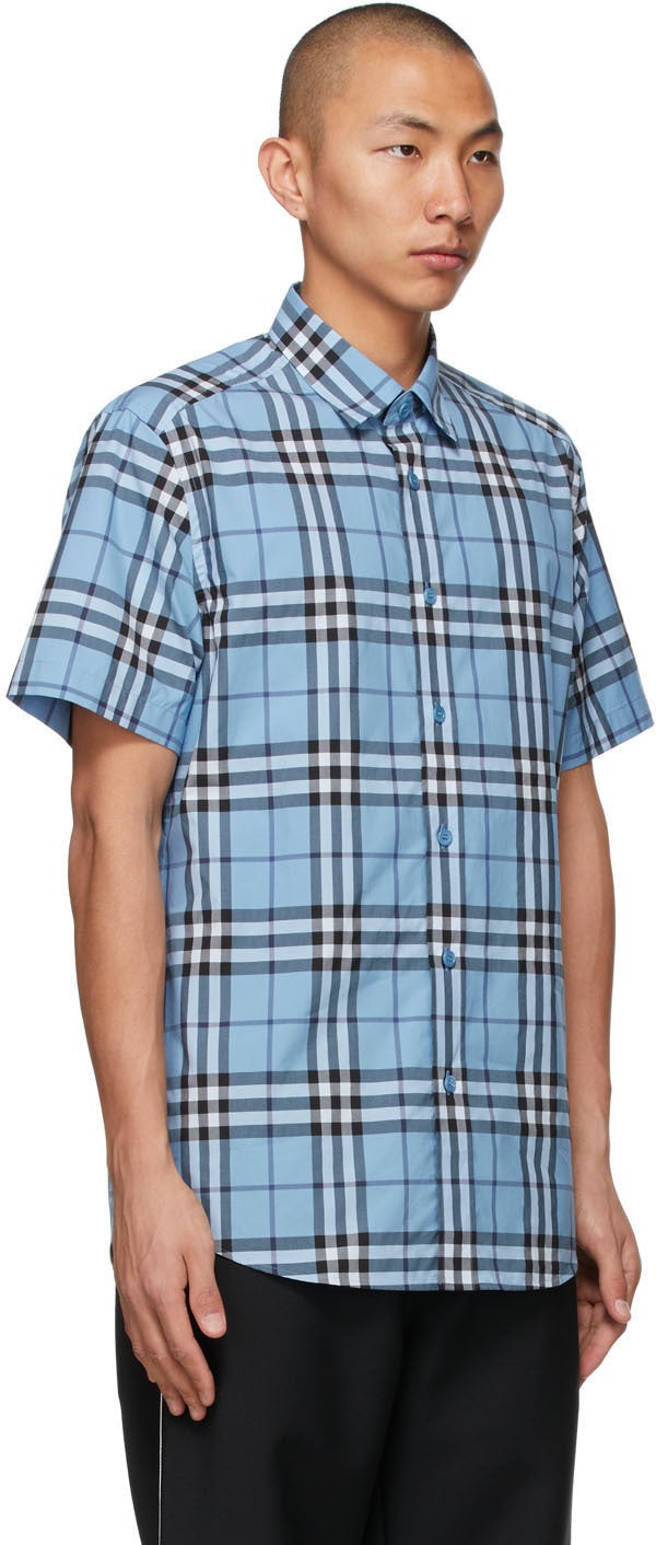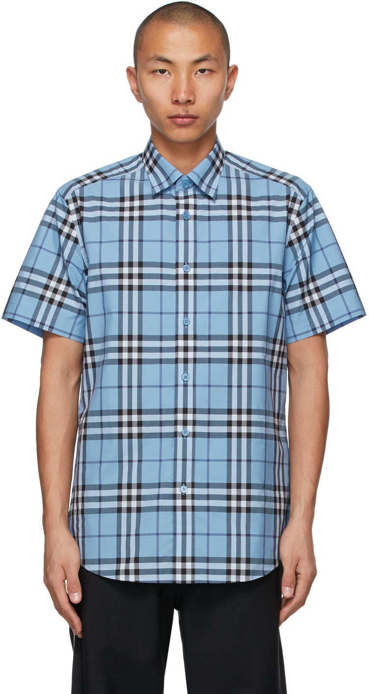 Short sleeve cotton poplin shirt featuring check pattern in blue, black, and white. Spread collar. Button closure at front. Shirttail hem. Tonal hardware. Supplier color: Vivi cobalt 100% cotton. Brand: Burberry