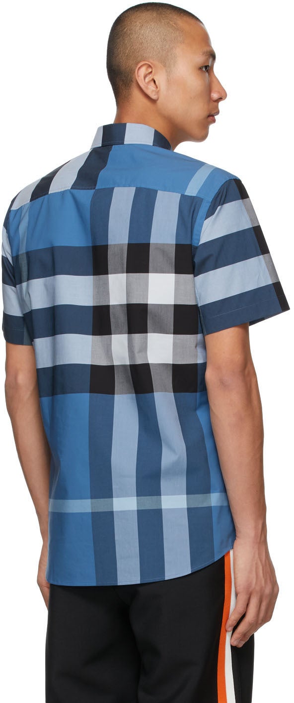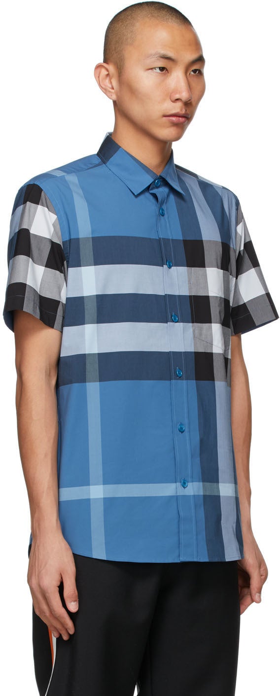 Short sleeve stretch cotton poplin shirt in blue featuring check pattern in black and white. Spread collar. Button closure at front. Patch pocket at chest. Shirttail hem. Tonal hardware. Supplier color: Dark cerulean blue 95% cotton, 5% elastane. Brand: Burberry