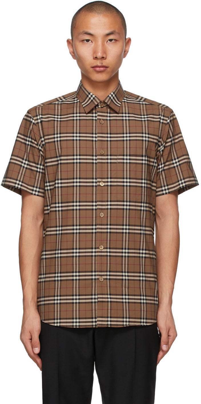 Short sleeve cotton poplin shirt in brown featuring signature check pattern in black, white, and red. Spread collar. Button closure at front. Shirttail hem. Tonal hardware. Supplier color: Birch brown 100% cotton. Brand: Burberry