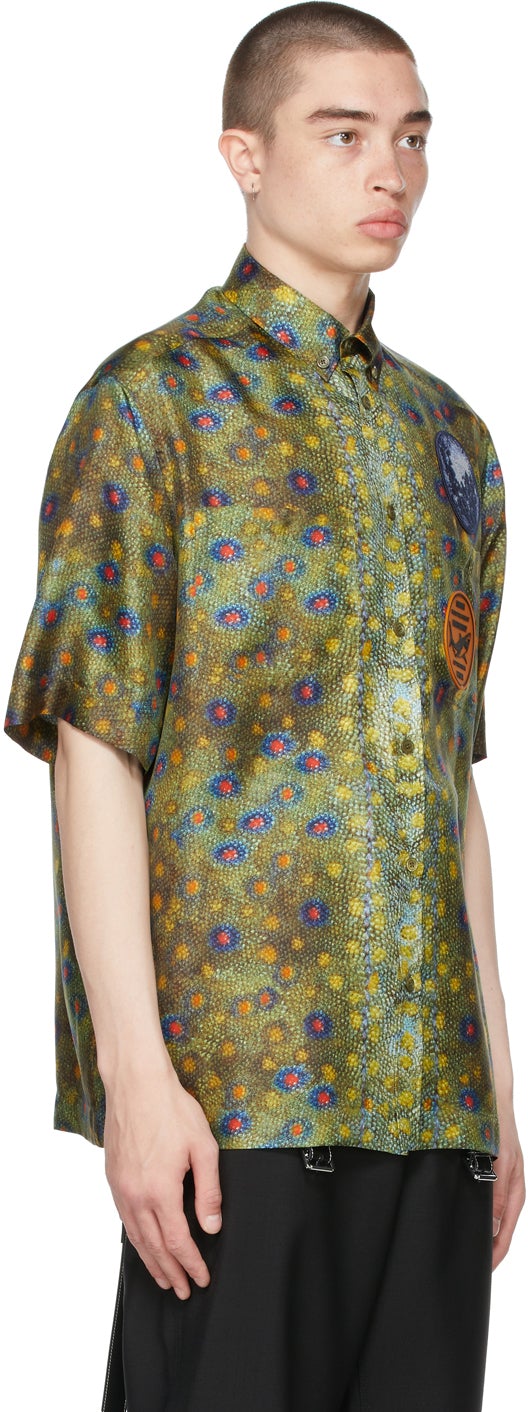 Short sleeve mulberry silk twill shirt in green featuring graphic pattern printed in multicolor. Spread collar. Button closure at front. Patch pockets, embroidered graphic patch in blue, and rubberized graphic patch in black and orange at chest. Textile logo patch in black and white at back collar. Shirttail hem. Tonal mother-of-pearl hardware. Supplier color: Olive 100% mulberry silk. Brand: Burberry