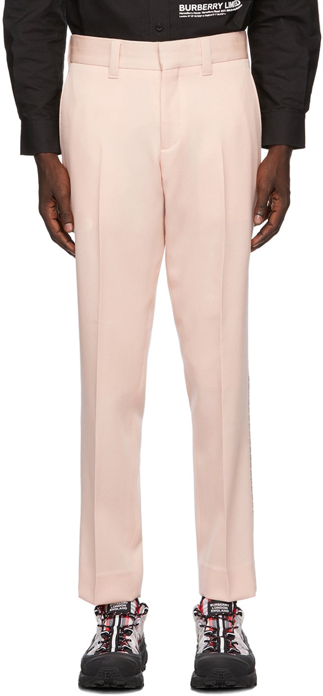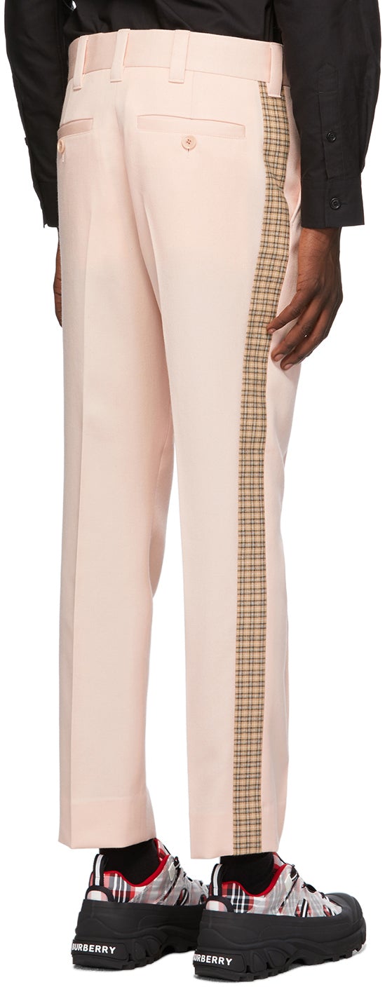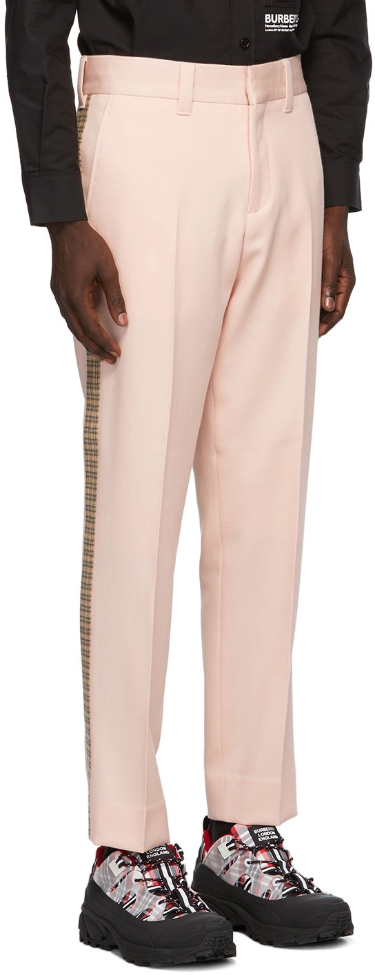 Straight-leg virgin wool twill trousers in pink. Mid-rise. Four-pocket styling. Belt loops at waistband. Central crease at front and back. Brushed cotton trim featuring check pattern in beige, black, and white at outseams. Partial cupro lining. Supplier color: Blush pink Body: 100% virgin wool. Lining: 100% cupro. Brand: Burberry