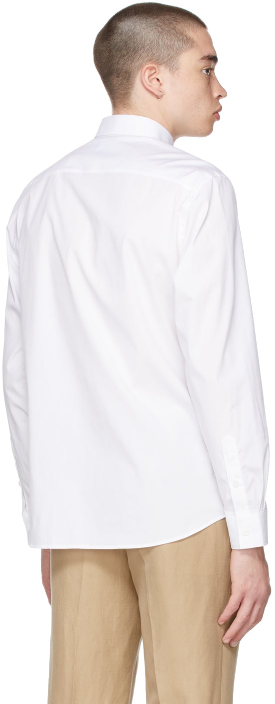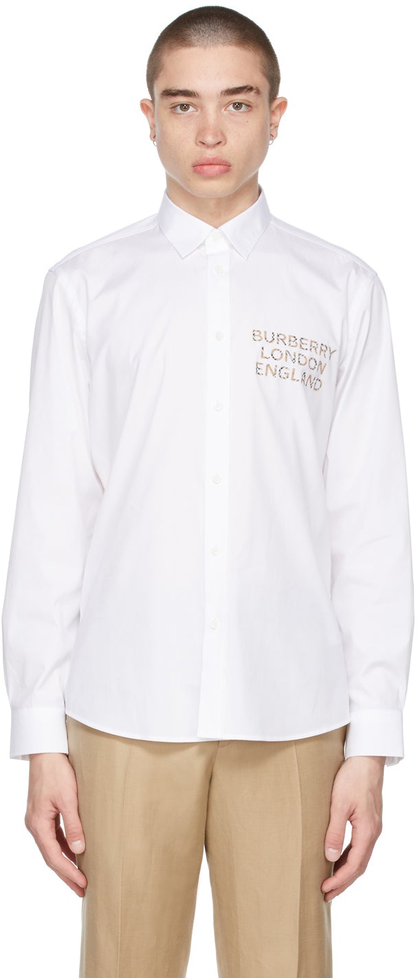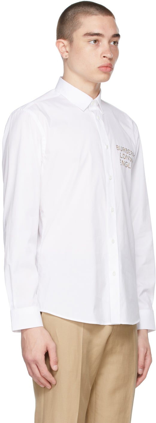 Long sleeve stretch cotton poplin shirt in white. Spread collar. Button closure at front. Bonded logo featuring signature check pattern in beige, white, and black at chest. Single-button barrel cuffs. Shirttail hem. Supplier color: White 97% cotton, 3% elastane. Brand: Burberry