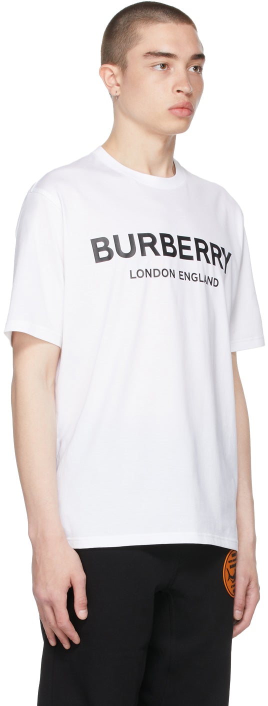 Short sleeve cotton jersey T-shirt in white. Rib knit crewneck collar. Logo printed in black at front. Supplier color: White Body: 100% cotton. Trim: 97% cotton, 3% elastane. Brand: Burberry