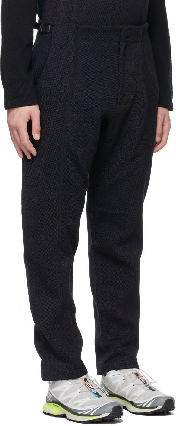 Relaxed-fit jacquard knit cotton trousers featuring graphic pattern in black, grey, and navy. Mid-rise. Four-pocket styling. Adjustable herringbone cinch straps at waistband. Grosgrain trim in black at front legs. Zip-fly. Tonal hardware. Supplier color: Dry black Body: 100% cotton. Trim: 51% cotton, 49% viscose. Brand: BYBORRE