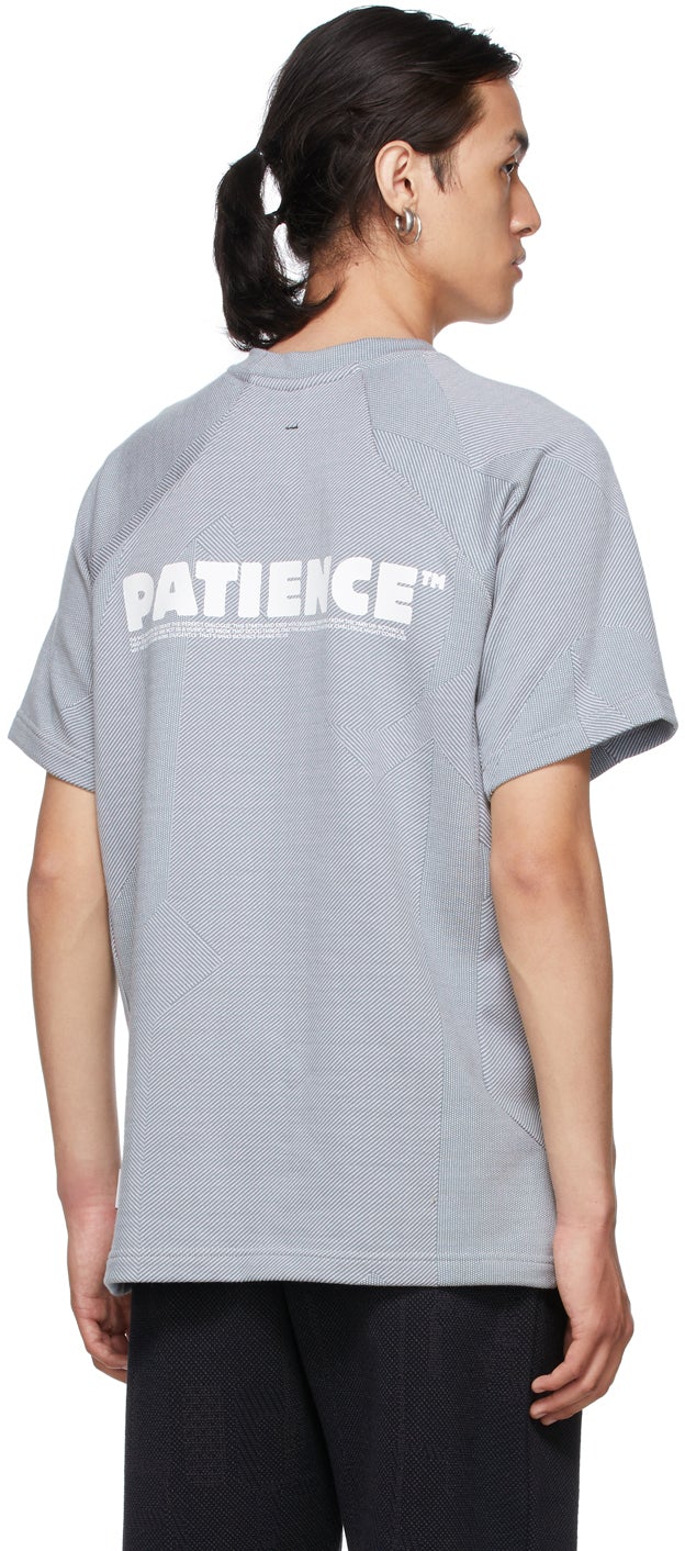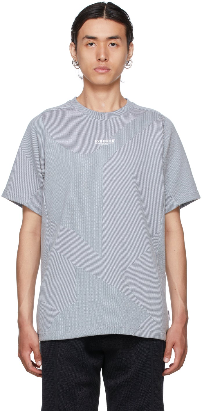 Short sleeve jacquard knit cotton T-shirt featuring graphic pattern in blue and white. Crewneck collar. Logo printed in white at front. Textile logo flag in white at side-seam. Text printed in white at back. Supplier color: Dusty blue 100% cotton. Brand: BYBORRE