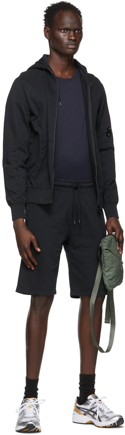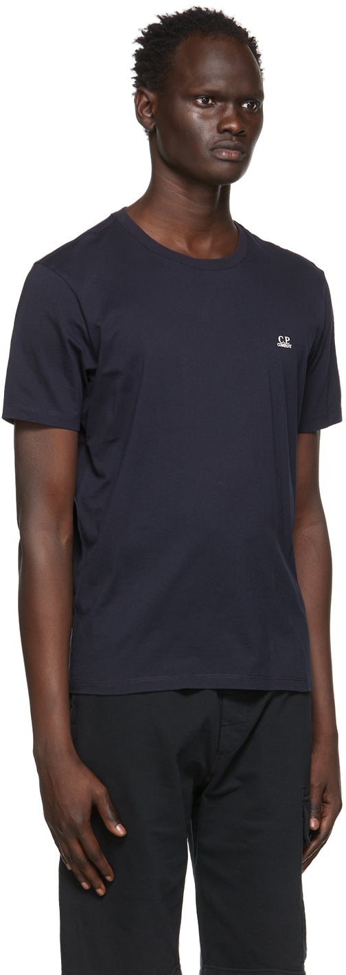 Short sleeve cotton jersey T-shirt in navy. Rib knit crewneck collar. Logo printed in white at chest. Supplier color: Total eclipse 100% cotton. Brand: C.P. Company
