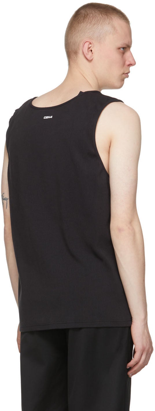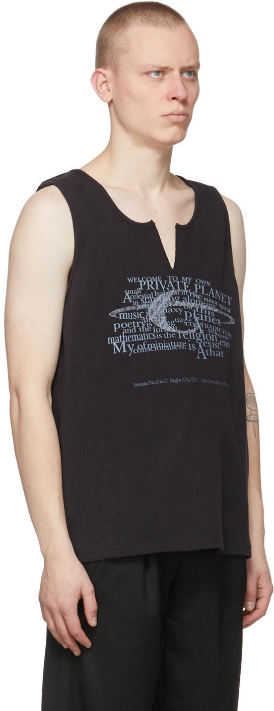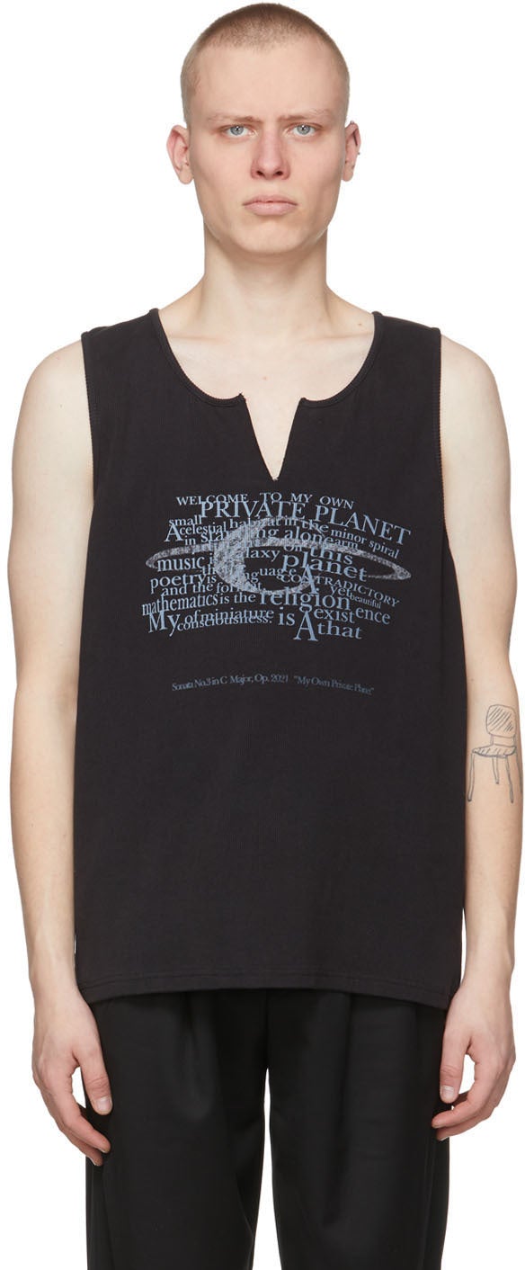 Sleeveless paneled stretch rib knit cotton and cotton jersey tank top in black. Layered construction. Cut-out and raw edge at crewneck collar. Text and graphic printed in tones of blue and grey at front. Logo printed in white at back collar. Part of the My Own Private Planet capsule collection. Supplier color: Faded black Body 1: 92% cotton, 8% spandex. Body 2: 100% cotton. Brand: C2H4