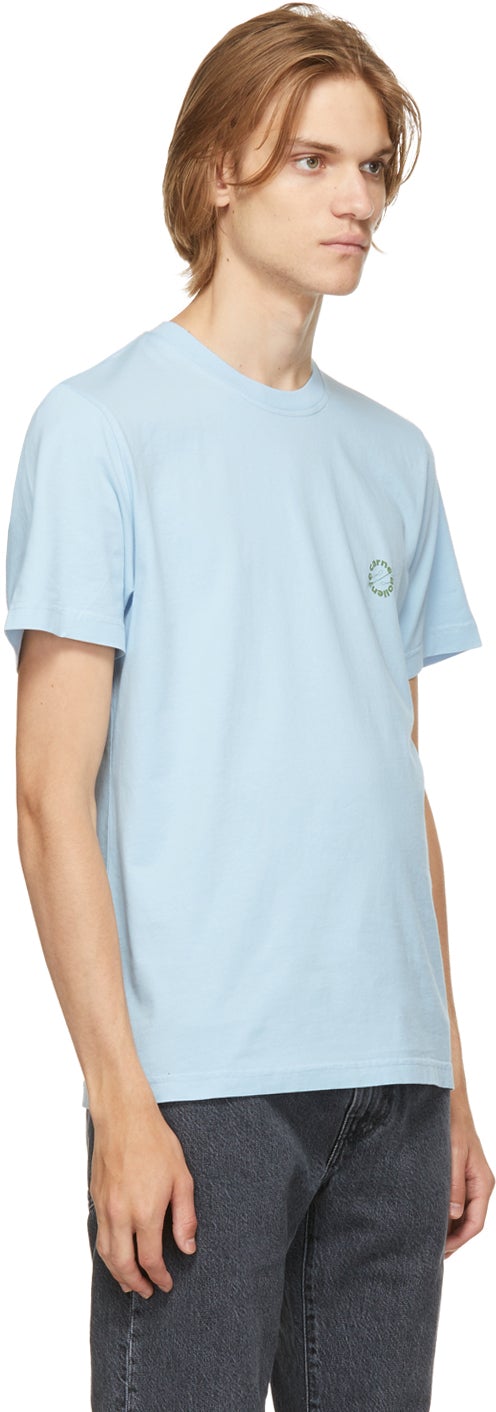 Short sleeve organic cotton jersey T-shirt in blue. Rib knit crewneck collar. Logo printed in green at chest. Graphic and text printed in multicolor at back. Supplier color: Washed blue 100% organic cotton. Brand: Carne Bollente