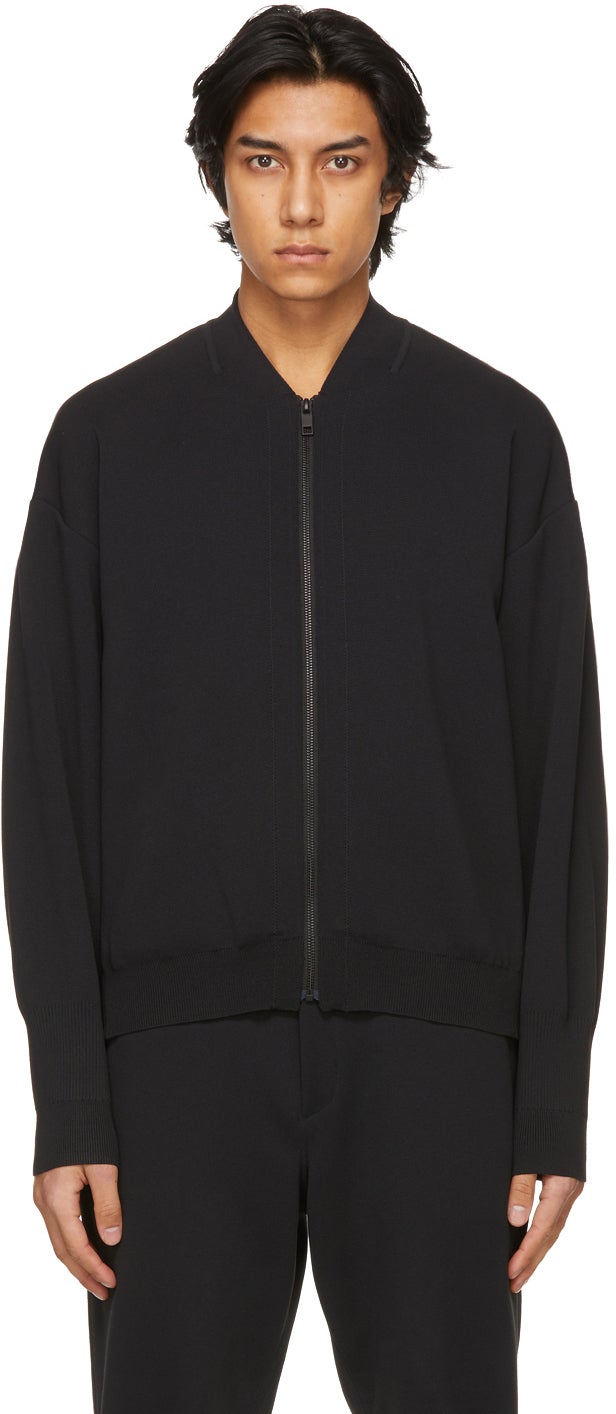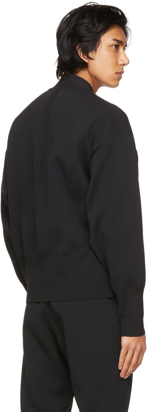 Long sleeve knit bomber jacket in black. Rib knit trim at stand collar. Zip closure at front. Welt pockets at waist. Rib knit cuffs and hem. Rib knit detailing at back. Unlined. Tonal hardware. Supplier color: Black 80% polyester, 20% recycled polyester. Brand: CFCL