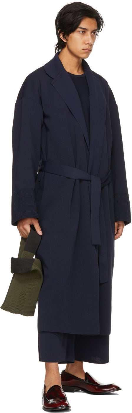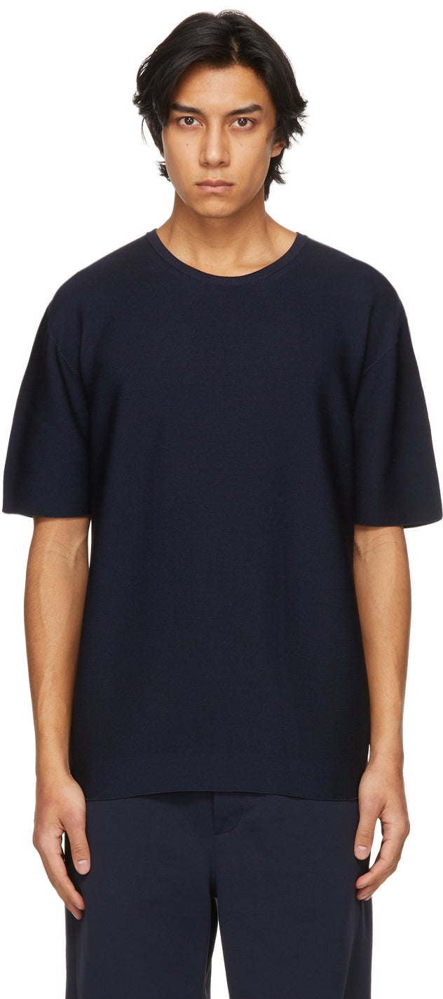 Half sleeve knit cupro-blend T-shirt in navy. Rib knit crewneck collar. Rib knit detailing at back. Tennis-tail hem. Supplier color: Navy 45% cupro, 29% polyester, 26% recycled polyester. Brand: CFCL